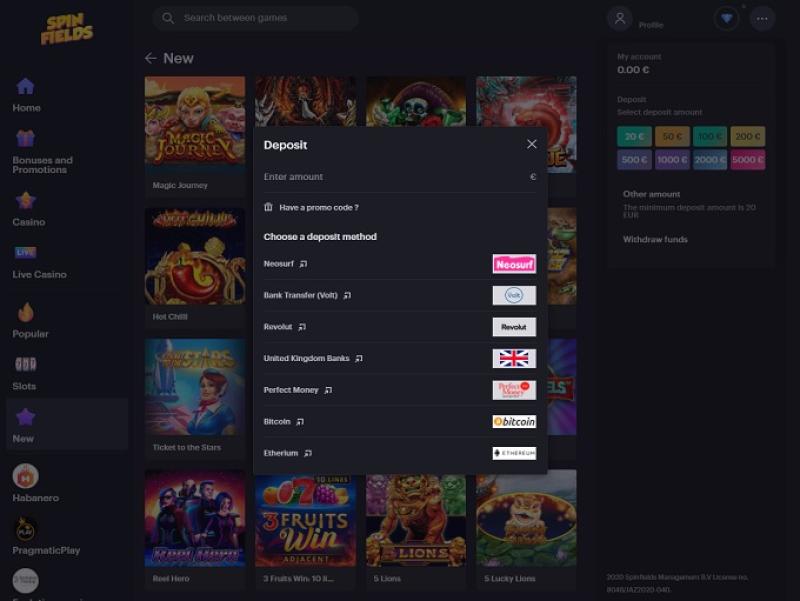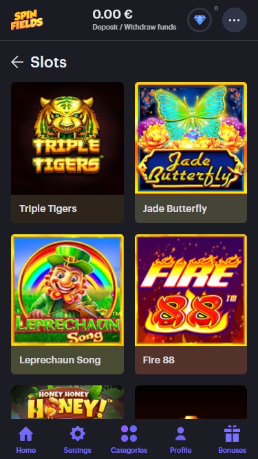 Казино Spinfields предлагает множество популярных игр, есть отдельный раздел с живыми дилерами, включающий различные комнаты для рулетки, блэкджека , баккары и покера, но главная его особенность — это слоты, так что можно с уверенностью сказать, что ценители игр с одним рулеточным бандитом почувствуют себя здесь как дома!