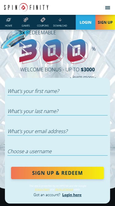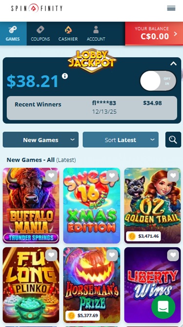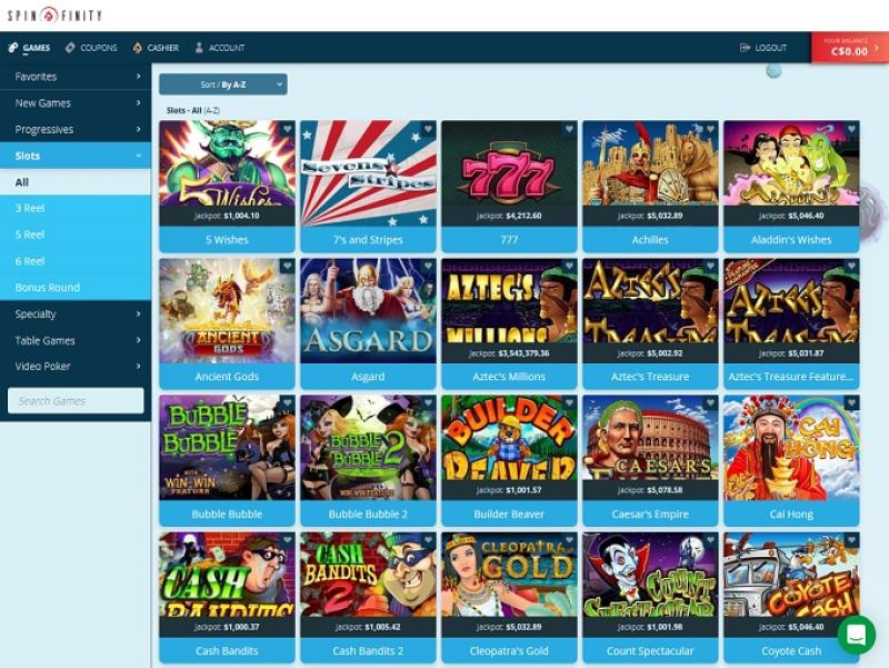 В Spinfinity представлен неплохой выбор видеослотов, поскольку компания использует платформу RTG, которую применяют многие американские казино. Также предлагается множество классических слотов с трехбарабанными версиями. Доступны прогрессивные джекпоты, и большинство игр имеют встроенную мобильную совместимость.