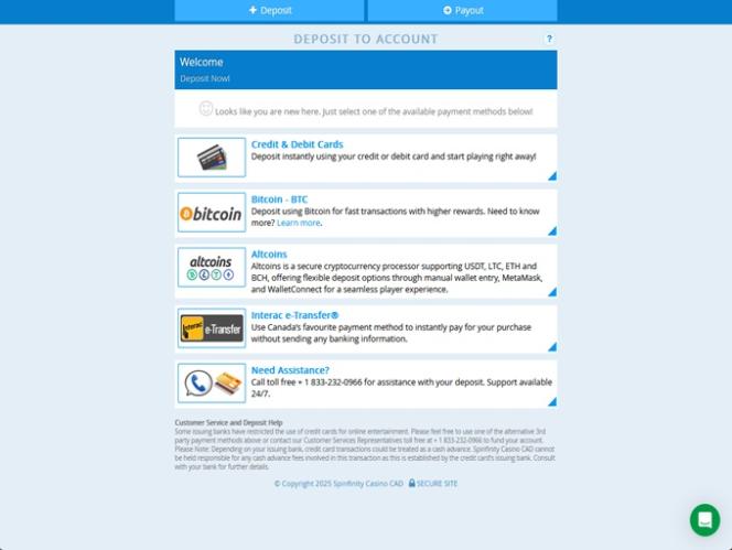 Банковские операции в Spinfinity неплохие, хотя здесь присутствуют стандартные недостатки, связанные с ориентацией на американцев. Время выплат хорошее, если вы используете криптовалюту, например, Bitcoin, но банковский перевод или оплата кредитной картой занимают немного больше времени. Существует еженедельный лимит на вывод выигрышей в размере 4000 долларов, что немного расстраивает, если вы выиграли крупную сумму.