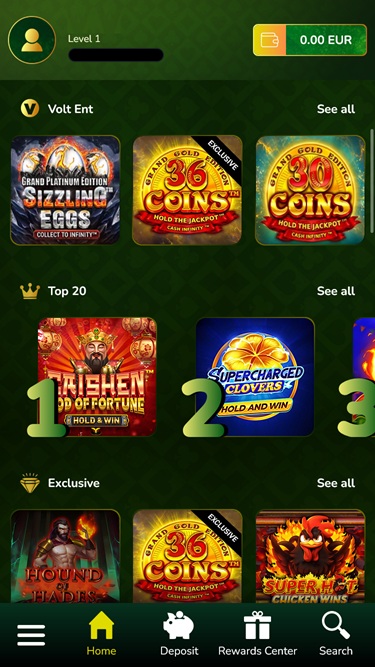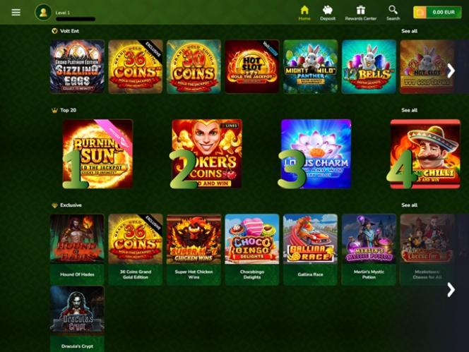 Сайт встречает вас спокойным интерфейсом в зеленых тонах, в котором легко ориентироваться. Слева вы найдете меню, позволяющее быстро переключаться между главной страницей, играми с живыми дилерами, лотереями и моментальными играми, центром вознаграждений и вкладкой «Подробнее». Во вкладке «Информация» вы найдете условия использования, политику конфиденциальности, раздел об ответственной игре, а также страницы «О нас» и «Контакты».