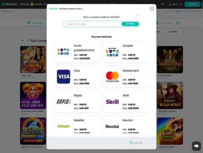 Казино Spinoli предлагает различные способы оплаты, такие как MiFinity, банковский перевод , Skrill, Netteler, Visa и MasterCard, а также множество криптовалютных вариантов, таких как Bitcoin, Bitcoin Cash , Ethereum, Litecoin, Ripple, Tether и USD Coin.