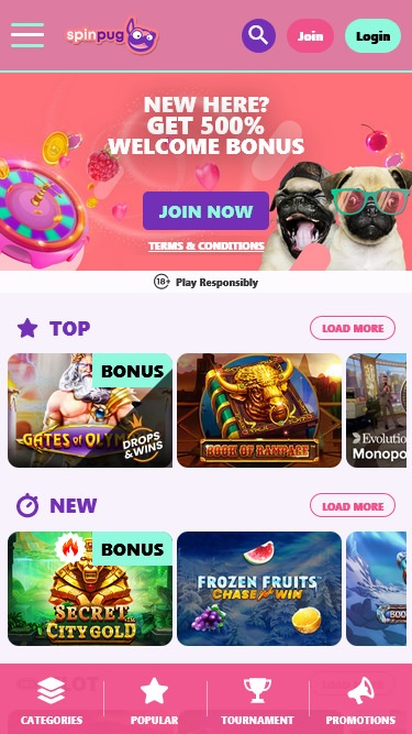 Милый мопс является талисманом бренда, и он улыбается и приветствует посетителей в верхней части полностью функциональной, хорошо продуманной главной страницы казино.
