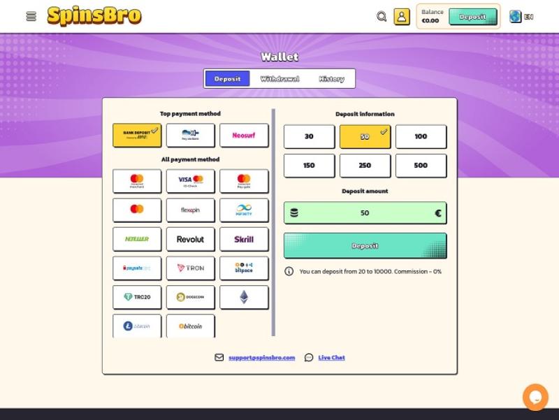 Что касается службы поддержки клиентов SpinsBro, вы можете связаться с ними по электронной почте или в онлайн-чате , и оба варианта отлично подходят. Следует отметить, что представители службы поддержки отвечают быстро и могут оказать большую помощь по самым разным вопросам. Мы рекомендуем обращаться к ним, если у вас возникнут какие-либо проблемы или вопросы, касающиеся SpinsBro.