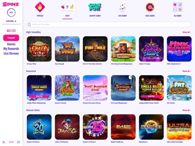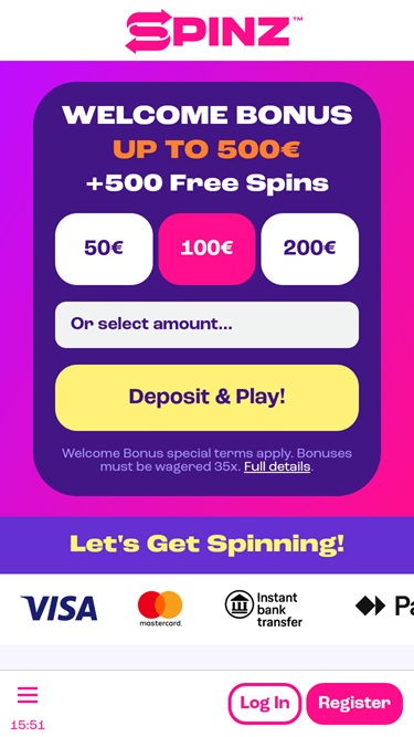 Удобный интерфейс в светлом режиме с преобладанием ярких розовых деталей оптимизирован для всех доступных устройств, независимо от размера или типа экрана. Это прекрасный вариант, поскольку игроки могут наслаждаться временем, проведенным в Spinz, за своим настольным компьютером, в любимом игровом кресле или на диване, или в дороге.