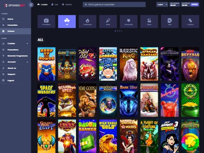 Если вы поклонник онлайн-слотов, то в казино SponsioBet вам точно не будет скучно. Мы настоятельно рекомендуем вам попробовать некоторые из самых популярных игр: Mask of Amun, Reel King Mega, Dynamite Riches Megaways, Rich Wilde and the Book of Dead, 9 Pots of Gold, ThunderStruck Stormchaser, Fisherman Fury Bonanza, Highways Legends, Rise of Olympus 100, 9 Masks of Fire, Beer Garden, Akiva Claws of Power, Cake & Ice Cream, Starburst, Burn 7s Burn, Big Egyptian Fortune, Football Finalx XUP и Rock Bottom.