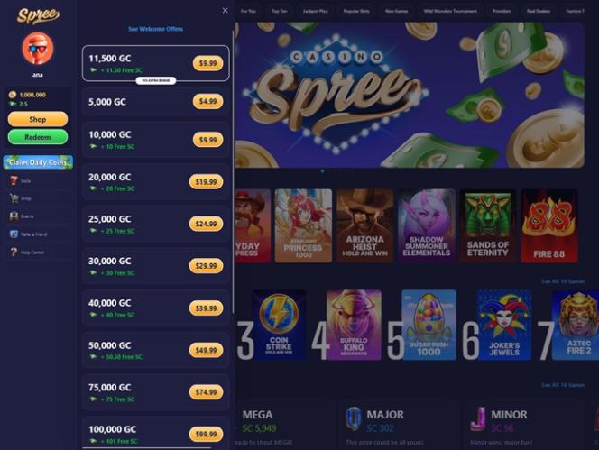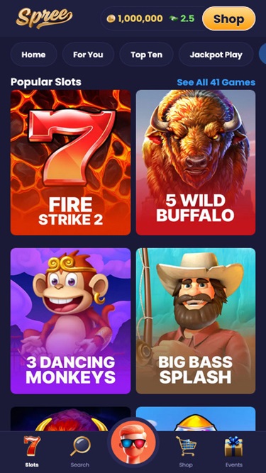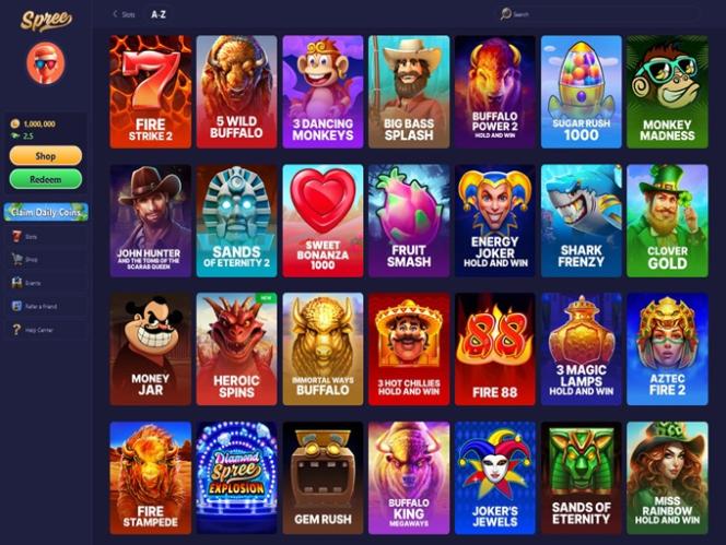 Игроки могут зарабатывать золотые и Spree Coins, участвуя в ежедневных акциях, турнирах и бонусах за регистрацию. Затем они могут использовать эти монеты для игры во все игры, участия в рекламных акциях или получения наград. На сайте также есть магазин, где можно приобрести золотые монеты.