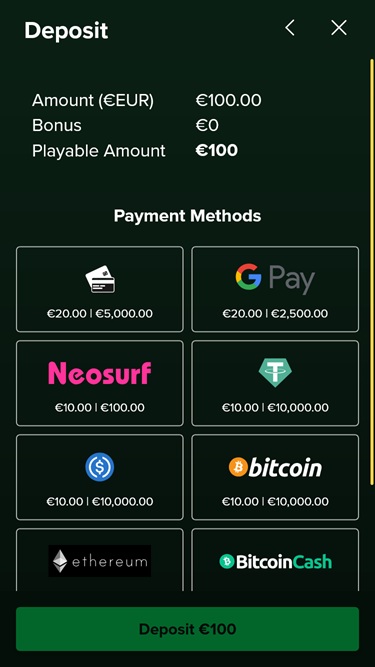 Игроки могут пополнять свои счета различными способами оплаты, включая Apple Pay , Google Pay , банковский перевод, популярные дебетовые и кредитные карты, а также различные криптовалютные платежи.