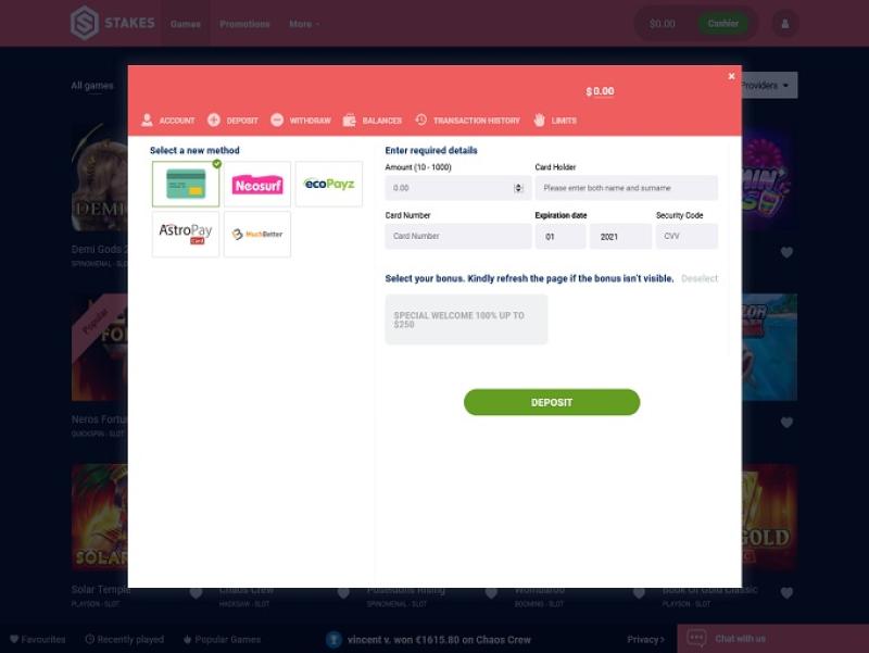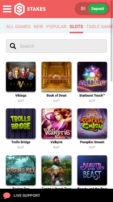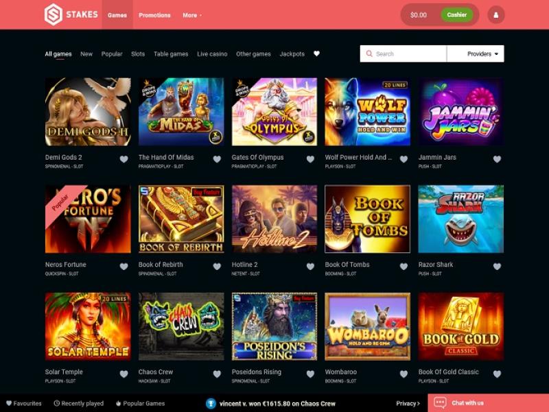 В казино Stakes представлен широкий выбор слотов, насчитывающий более 1000 игр от таких разработчиков, как Microgaming, NetEnt и других. Казино предлагает прогрессивные джекпоты, а также множество тематических игр и функций на любой вкус. Казино также полностью поддерживает мобильные слоты, позволяя играть на смартфоне.