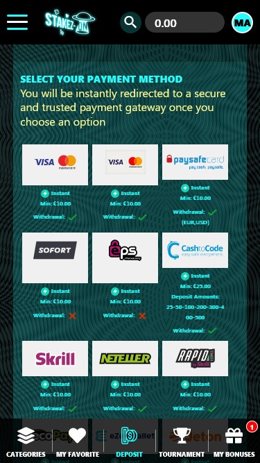 Варианты банковских операций в StakezOn Casino