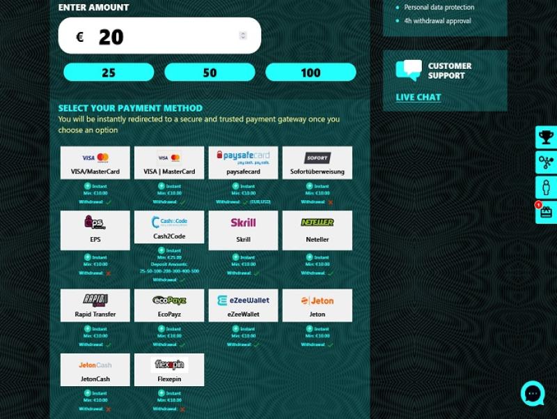 Что касается банковских операций, здесь представлено множество вариантов, больше, чем во многих других онлайн-казино. Вы можете внести деньги с помощью MasterCard, Visa, Skrill и многих других. Также есть возможность пополнить счет с помощью Neteller или криптовалют, если вам это удобнее.