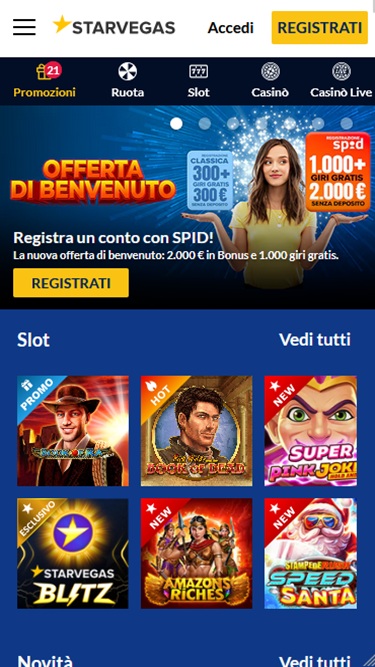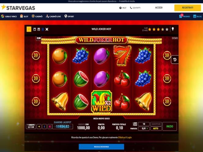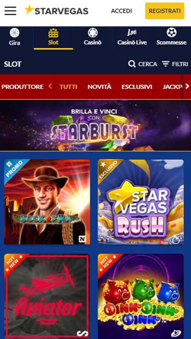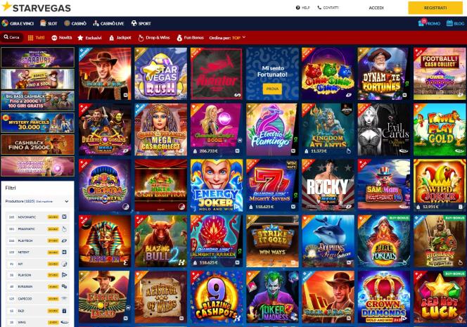 На сайте StarVegas.it представлен хороший выбор видео- и классических игровых автоматов, причем игры почти исключительно являются уникальными проектами, разработанными их создателями. Это дает вам возможность сыграть в такие игры, как Lord of the Ocean, Secret Elixir, Pharaoh's Ring, Lucky Lady's Charm Deluxe и десятки других. Также доступны прогрессивные джекпоты, которые могут принести призы на сумму до шестизначных цифр. Доступны и мобильные версии слотов, позволяющие играть на смартфоне или планшете.