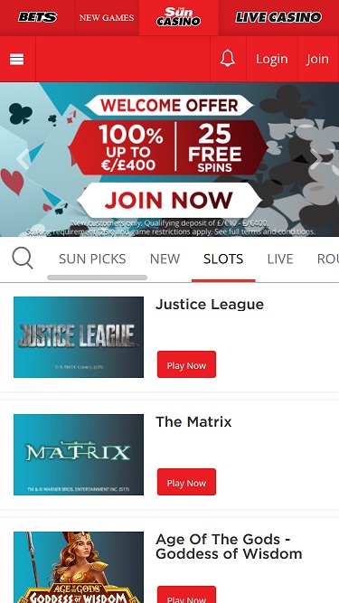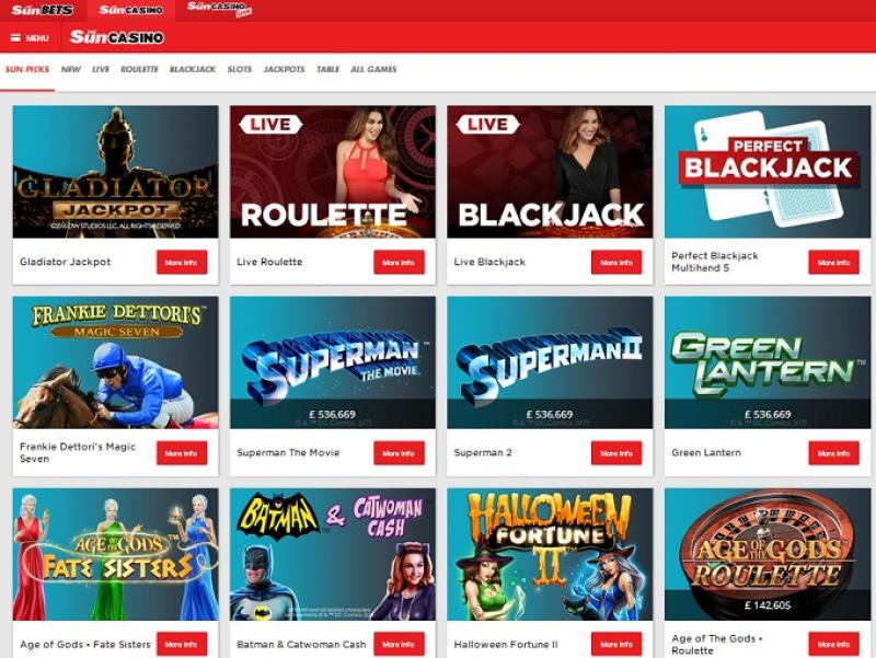 В Sun Bets представлен большой выбор как классических, так и видеослотов, поскольку разработчик предлагает все игры Playtech, включая как лицензированные, так и уникальные проекты. Также доступны несколько прогрессивных джекпотов, дающих игрокам шанс выиграть крупные призы, такие как Gladiator, Sweet Party и Everybody's Jackpot. Мобильные версии слотов также доступны, так что вы можете играть на ходу со своего смартфона.