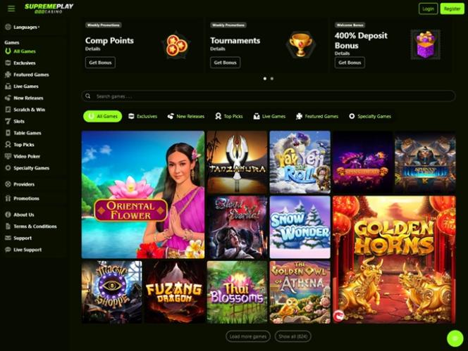 Казино Supreme Play работает на программном обеспечении BetSoft, Genesis Gaming, Rival, Saucify, Vivo Gaming, Spinomenal, Felix Gaming, Fugaso, Radi8 Games, Fresh Deck Studios, Woohoo Games, Qora Games, SmartSoft Gaming, Tom Horn Gaming, Genii, Wager Gaming, Dragon Gaming and Dragoon Soft , которое можно найти в казино, предлагающих гораздо лучшие слоты. Игроки могут получить доступ к казино как через загружаемый программный клиент, так и через веб-платформу.Другие игры