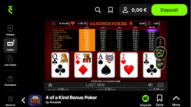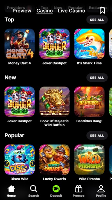 Помимо главной страницы «Предварительный просмотр», игроки могут получить доступ к расширяемому вертикальному меню, позволяющему просматривать основные страницы. Оттуда они могут просматривать все категории игр, включая цифровые игры и игры с живыми дилерами, а также ознакомиться со всеми доступными акциями, которыми они могут воспользоваться.