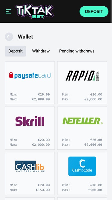TikTak Bet может отказать в приеме депозитов по своему собственному усмотрению.