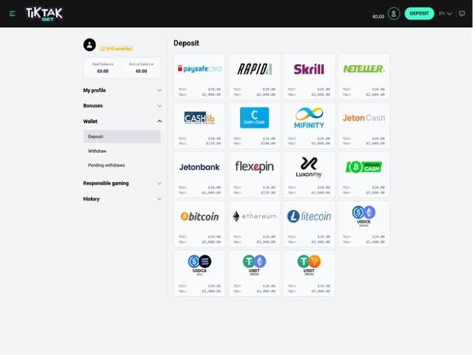 Касса TikTak Bet поддерживает надежные способы оплаты, включая Apple Pay и другие электронные кошельки, платежные карты, банковские переводы, а также более двадцати дополнительных традиционных и криптовалютных способов . Однако следует помнить, что некоторые банковские услуги недоступны во всех юрисдикциях для онлайн-гемблинга.