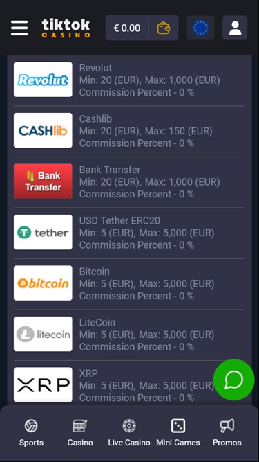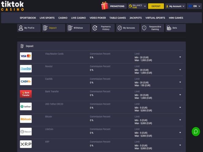 Доступность способов оплаты — еще один важный фактор, над которым TikTok Casino усердно работало. Игроки могут выбирать из множества вариантов пополнения своего баланса в казино. Традиционные методы включают Visa , Mastercard , банковский перевод , Jeton , MiFinity , eZeeWallet и другие, а современные варианты включают криптовалюты, такие как Bitcoin , Ethereum , Litecoin , Tether и Ripple .