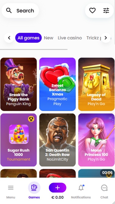 Trickz располагает превосходным разделом игр с живыми дилерами. Вот некоторые из игр, включенных в этот раздел: Crazy Time, Blackjack, Lightning Roulette, Free Bet Blackjack 1, Infinite Blackjack, Immersive Roulette, Monopoly Big Baller, Powerup Roulette, Crazy Coinflip, Sweet Bonanza Candyland, Boom City, Monopoly, Mega Roulette, Mega Wheel, Gold Bar Roulette, Casino Hold'em, Deal or no Deal, Baccarat, Fan Tan, 2 Hand Casino Hold'em, Lightning Dice, Side Bet City, Dragon Tiger, Free Bet Blackjack, Baccarat Control, Gonzo's Treasure Hunt и другие.