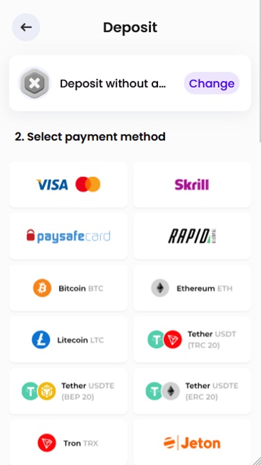 Оператор предлагает опцию «Плати и играй», которая позволяет мгновенно зарегистрироваться, как только игроки выберут предпочтительный способ оплаты и внесут депозит.