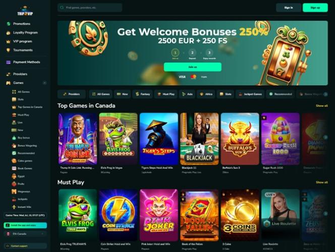 При входе в Trip2Vip игроки заметят, что дизайнеры выбрали довольно стандартную эстетику: современный плоский дизайн и привлекательная цветовая палитра из серых фонов и зеленых оттенков. Хотя это не самый оригинальный дизайн, который мы видели в наших обзорах, он отнюдь не непривлекателен.