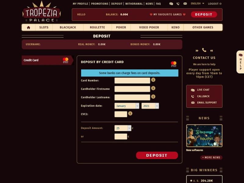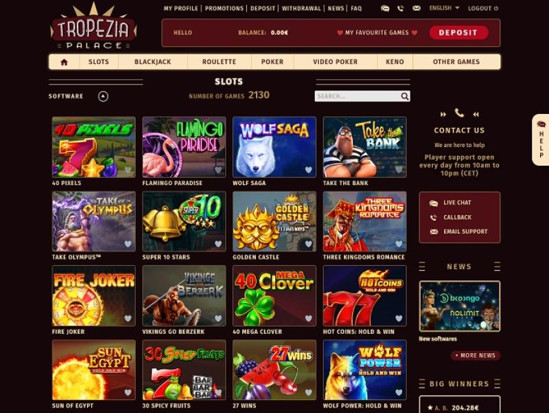 Казино Tropezia Palace работает на программном обеспечении Net Entertainment, Playtech, BetSoft, Amatic Industries, Big Time Gaming, ELK Studios, Evolution Gaming, EYECON, Play'n GO, playson, Quickspin, Relax Gaming, Yggdrasil, Wazdan, Booming Games, Stakelogic, Pragmatic Play, Nolimit City, Red Tiger Gaming, Booongo, Spinomenal, Felix Gaming, Red Rake Gaming, Fugaso, Fantasma Games, Kalamba, Skywind, Pocket Games Soft, Bulletproof Games, Gluck Games, TrueLab Games, Amusnet Interactive, Ash Gaming, Push Gaming, Noble Gaming, Reflex Gaming, Wild Streak Gaming, Jade Rabbit Gaming, RubyPlay, 4ThePlayer, AvatarUX, Gamevy, High 5 Games, ReelPlay, Rarestone Gaming, BB Games, Boomerang Studios, Hacksaw Gaming, Max Win Gaming, Bang Bang Games and Peter And Sons , которое предоставляет игрокам сотни игр через свою веб-платформу. Процесс регистрации в казино быстрый и эффективный, занимает всего несколько минут, а навигация по сайту удобна. Игроки, ищущие конкретную игру, могут воспользоваться функцией поиска, которая, судя по всему, хорошо работает при поиске настольной игры или слота.Blackjack