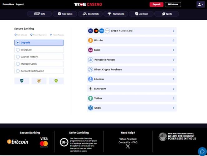 Одна из интересных особенностей — возможность пополнения счета с помощью биткоинов . Криптовалютные платежи становятся все более популярными, и приятно видеть, что True Poker присоединяется к этой тенденции, делая транзакции быстрее и анонимнее. Если криптовалюта вам не подходит, они по-прежнему предлагают традиционные варианты, такие как кредитные карты, так что у вас есть выбор.