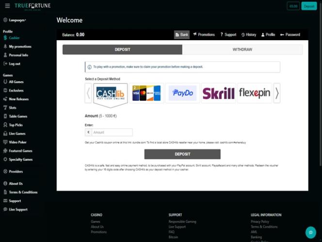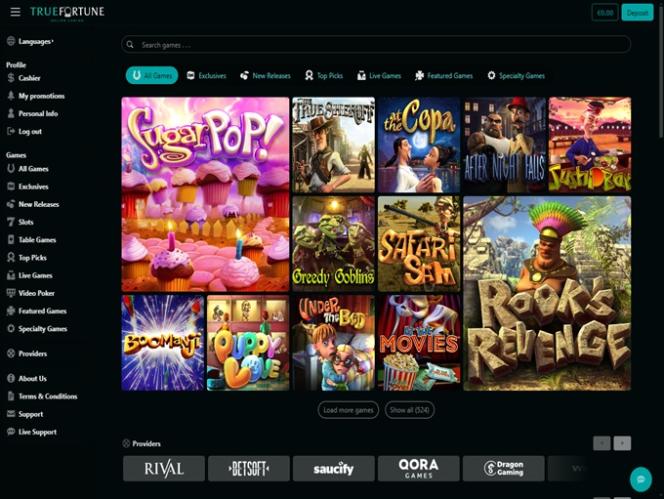 Казино True Fortune работает на платформе BetSoft, Genesis Gaming, Rival, Saucify, Radi8 Games, Fresh Deck Studios, Woohoo Games, Qora Games, Genii and Dragon Gaming , а игры предоставляются через веб-платформу, которая загружается в вашем любимом браузере. Сайт хорошо разработан и прост в навигации. Я также смог играть на своем смартфоне, так как сайт поддерживает мобильные устройства.Другие игры