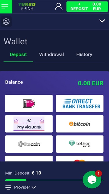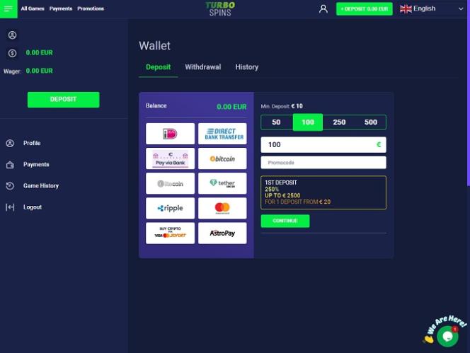 TurboSpins принимает популярные криптовалюты и предлагает быстрые платежные транзакции с помощью надежных способов оплаты. Кроме того, игроки могут рассчитывать на профессиональную службу поддержки клиентов, работающую круглосуточно.