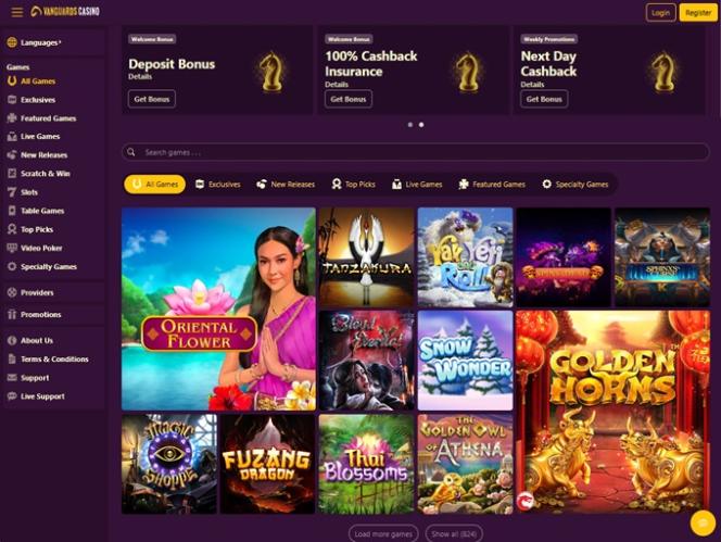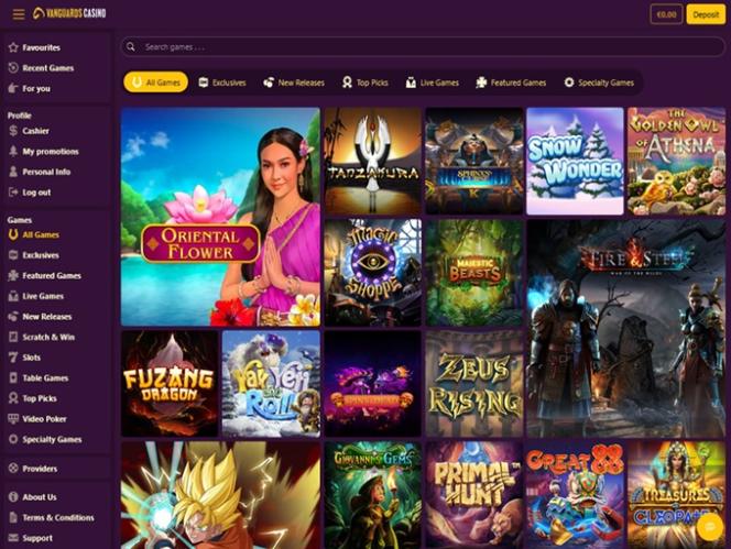 В казино Vanguard представлен широкий выбор игровых автоматов, включая как классические, так и видеослоты. Также в казино есть мобильные слоты и ряд прогрессивных джекпотов, предлагающих клиентам крупные денежные призы.