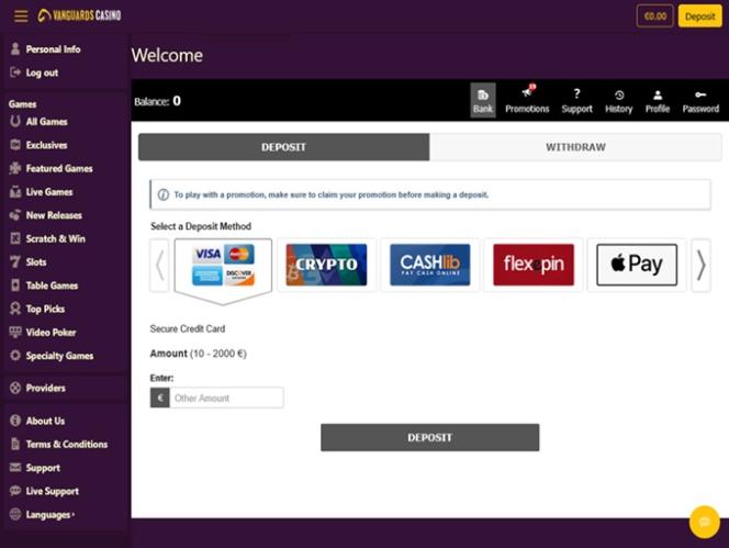 Прочитав условия и положения, я не нашел в Vanguard Casino ничего, что указывало бы на хищнический или несправедливый подход к игрокам. Банковская система в Vanguard Casino достаточно хороша: депозиты и снятие средств обрабатываются через Visa, ecoPayz, Skrill и Neteller. Депозиты также можно вносить через uPayCard, MasterCard, UseMyBank, American Express и Paysafecard. Игроки могут рассчитывать на обработку вывода средств в течение 2-5 рабочих дней, а еженедельный лимит на вывод средств составляет 4000 долларов.