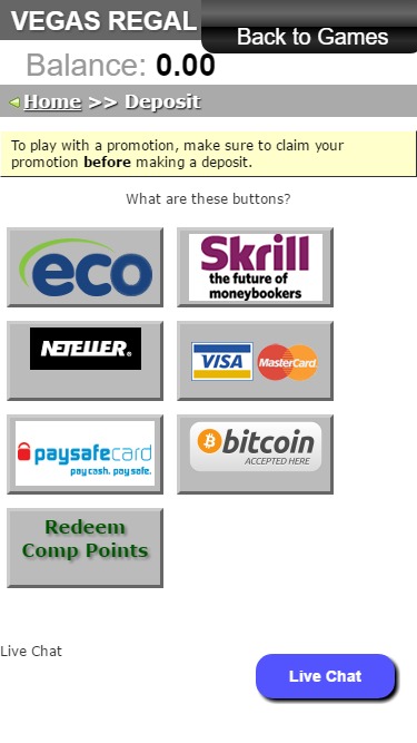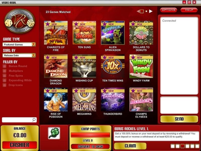 Казино Vegas Regal работает на программном обеспечении Rival , и игры казино доступны как через загружаемое программное обеспечение, так и через веб-платформу мгновенной игры, которая позволяет зарегистрироваться, внести депозит и играть прямо в веб-браузере. Также предусмотрена поддержка мобильных устройств, позволяющая игрокам играть со смартфона или планшета.Другие игры