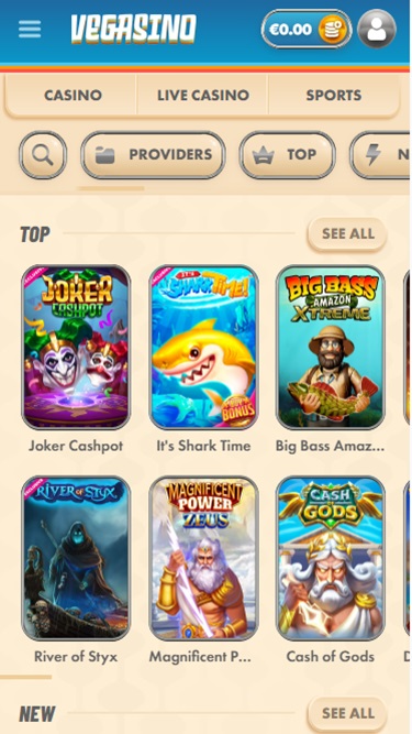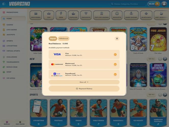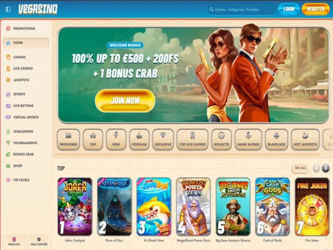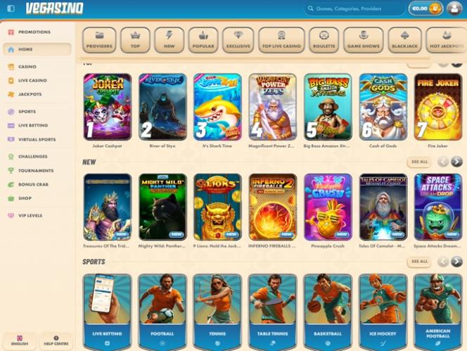 В казино Vegasino также есть расширяемое вертикальное меню в левой части сайта, где игроки могут легко получить доступ ко всем рекламным материалам, основным категориям игр, магазину, VIP-программе и турнирам. Здесь же они могут выбрать язык сайта, доступны следующие варианты: немецкий, итальянский, французский, греческий, испанский, финский, норвежский, португальский, польский, чешский и турецкий.