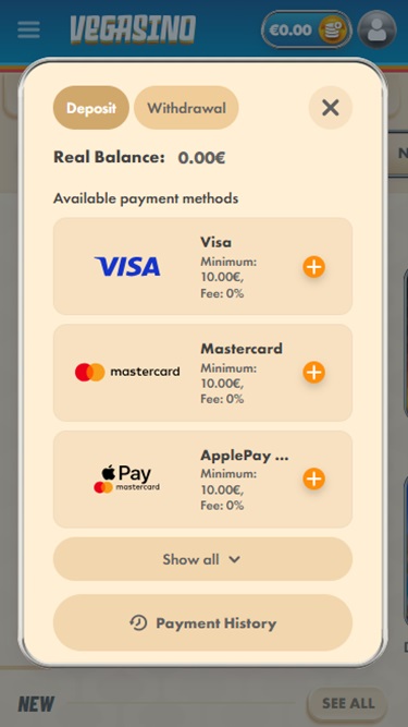Обеспечение доступности платежей для игроков должно быть одним из главных приоритетов для казино. Именно поэтому Vegasino позволяет своим пользователям вносить и выводить средства, используя множество способов, таких как Visa , Mastercard , Skrill , Paysafecard , Neteller , MiFinity и Jeton . Компания также принимает криптовалюты в качестве допустимого способа оплаты: Bitcoin , Dogecoin , Litecoin и Tether .