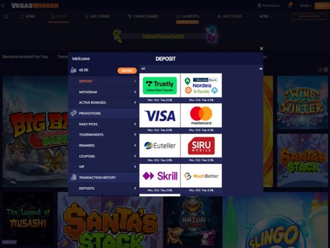 Прочитав условия и положения казино VegasWinner, я не обнаружил ничего, что бы указывало на несправедливость или хищническое отношение к игрокам. Система банковских операций в VegasWinner разнообразна: пополнение и вывод средств доступны через банковский перевод, Neteller, Visa, MasterCard, PayPal, Skrill, ecoPayz, Paysafecard, WebMoney, ClickandBuy и Maestro. Пополнение счета также принимается через Moneta.ru, iDeal, PugglePay, EntroPay, Neosurf, Postepay, Solo, Giropay, SOFORT Banking, EPay, Wirecard, Instand Bank, Yandex и Poli. Вывод средств также возможен через Speedcard. В казино установлен ежемесячный лимит на вывод средств в размере €10 000, а выплаты через электронные кошельки обрабатываются в тот же день, в то время как другие методы могут занять от 2 до 7 рабочих дней.