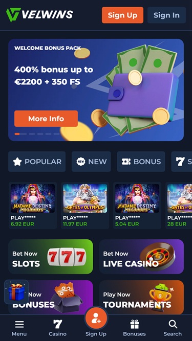 Velwins — это огромное онлайн-казино, ориентированное в первую очередь на игроков изНидерландов , предлагающее большое количество игр и вариантов ставок на спорт. В каталоге представлено более 9000 игр, включая онлайн-слоты, игры с живыми дилерами, настольные игры и мгновенные краш-игры, а также предлагается широкий спектр акций и бонусов.