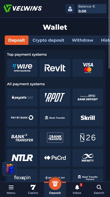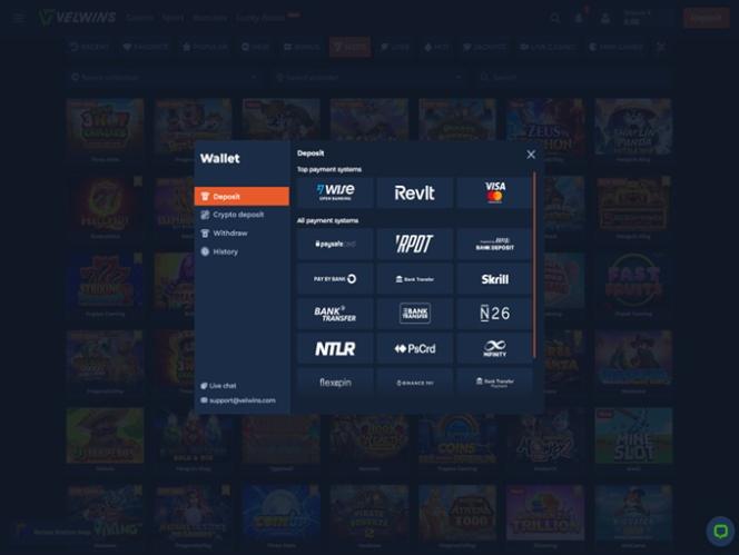 Для управления своими средствами в казино Velwins вы сможете использовать несколько способов оплаты, включая такие популярные варианты, как Visa , Mastercard, банковский перевод, Flexepin , Skrill , Neteller , MiFinity и Paysafecard . Кроме того, игроки могут использовать множество криптовалют в качестве действительных способов оплаты, включая Bitcoin, Cardano , Dogecoin, Ethereum , Litecoin , Solana , Tron , USD Coin и Tether.