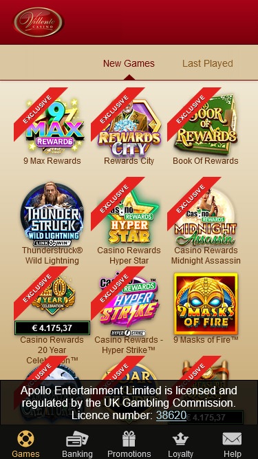 Казино Villento Las Vegas было основано в 2006 году и стало уважаемым онлайн-казино, известным своей удобной системой банковских операций, обширной игровой библиотекой и превосходным управлением, которое честно относится к игрокам. Казино управляется компанией Casino Rewards, которая также управляет большим количеством других онлайн-казино, таких как высоко оцененное Grand Mondial.Информация о казино