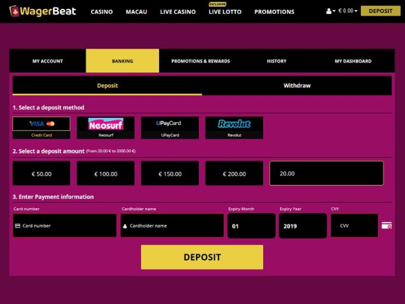 Банковская система Wager Beat хороша: казино предлагает варианты пополнения и вывода средств с помощью кредитных карт, электронных кошельков и банковских переводов. Однако время обработки платежа составляет 48 часов, а при использовании других способов, кроме электронных кошельков, обработка может занять на несколько дней больше. На сайте действует лимит на вывод средств в размере 10 000 долларов каждые 10 дней.