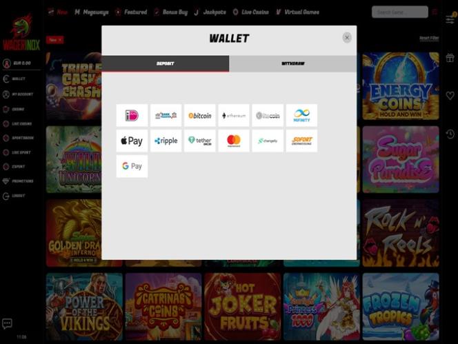 Wagerinox предлагает множество популярных способов оплаты, включая широко используемые электронные кошельки и другие онлайн-системы платежей. Игроки могут выбирать между кредитными и дебетовыми картами, банковскими переводами и другими видами денежных переводов. Обратите внимание, что доступные варианты зависят от страны, поэтому вам следует проверить кассу казино, чтобы убедиться, что выбранный вами способ доступен в вашем регионе.