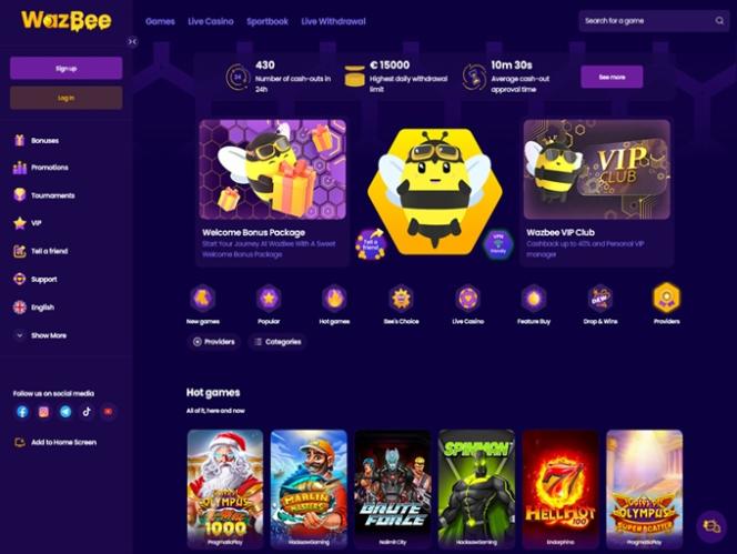 Запущенное в 2023 году казино Wazbee создало огромный игорный сайт, который удовлетворяет потребности практически любого типа игроков, предоставляя им множество вариантов ставок на спорт и игр, включая онлайн-слоты, игры с живыми дилерами, игры с живыми дилерами и настольные игры. Благодаря отличной программе акций, невероятно быстрой обработке выплат и инновационной системе «Live Withdrawal», неудивительно, почему так много игроков решили попробовать этот бренд!
