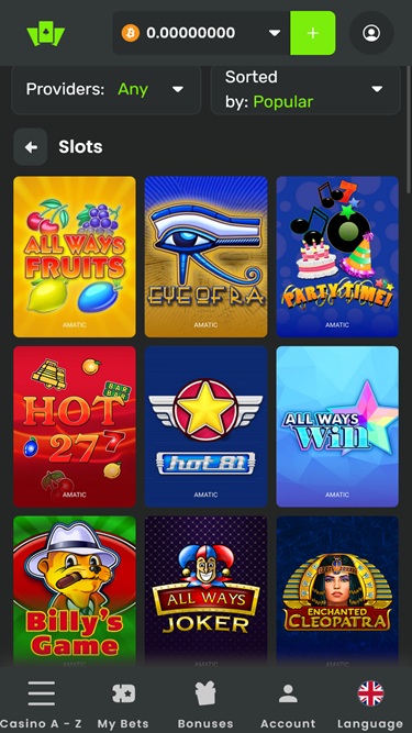 Что касается конкретных категорий и жанров игр казино, то онлайн-слоты занимают первое место по частоте выбора игроков. Бренд предлагает потрясающий выбор слотов на реальные деньги, в каталоге которого представлены практически все возможные поджанры, включая бонусные покупки, кластерные выплаты, джекпоты, Megaways, новейшие релизы и слоты старой школы.