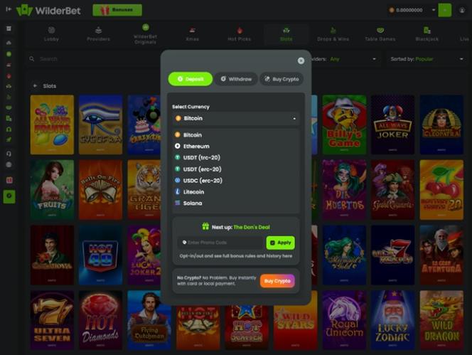 Казино WilderBet — это в первую очередь сайт азартных игр, ориентированный на криптовалюты, который принимает несколько криптовалют для пополнения счета и вывода средств, включая Bitcoin , Ethereum , Litecoin , Solana , USD Coin и Tether. Игроки также могут использовать традиционные способы оплаты, такие как Visa , Mastercard и банковский перевод, для пополнения счета непосредственно на сайте.