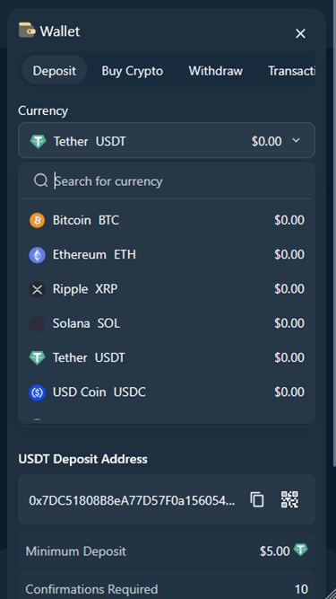 Что касается банковских операций, то вносить депозиты можно только с помощью криптовалют . Доступные криптовалюты: Bitcoin (BTC), Ethereum (ETH), Bitcoin Cash (BCH), Litecoin (LTC), Dogecoin (DOGE), Cardano (ADA), Ripple (XRP), Tron (TRX), Binance Coin (BNB) и Tether (USDT).