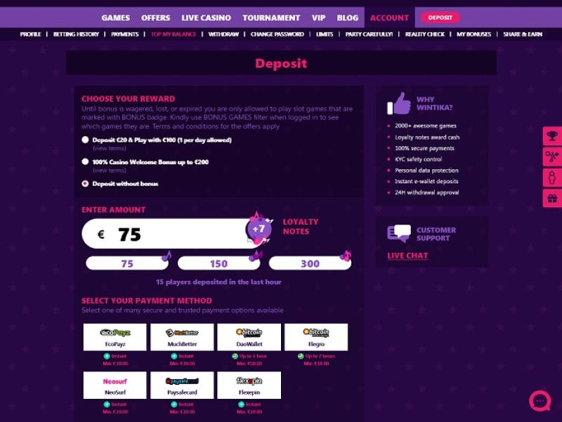 Казино Wintika работает на программном обеспечении Microgaming, Net Entertainment, 1x2gaming, Amatic Industries, Big Time Gaming, ELK Studios, Evolution Gaming, Ezugi, iSoftBet, Oryx, playson, Quickspin, Relax Gaming, Thunderkick, Yggdrasil, Endorphina, Wazdan, Betgames, Booming Games, Stakelogic, Pragmatic Play, Nolimit City, Felt Gaming, Red Tiger Gaming, Red Rake Gaming, Fantasma Games, SYNOT Games, Kalamba, Revolver Gaming, Skywind, Spinmatic, Spadegaming, BGAMING, Northern Lights Gaming, Electric Elephant Games, Pocket Games Soft, Bulletproof Games, Gluck Games, Slot Factory, Spearhead Studios, Swintt, HungryBear Gaming, Blue Guru Games, Lady Luck Games, Games Global, Amusnet Interactive, Wizard Games, Blueprint Gaming, CT Interactive, GamesOS, Leander Games, Merkur Gaming, Pariplay, Push Gaming, Tom Horn Gaming, Gamomat, Reel Time Gaming, BF Games, Bally Wulff, Just For The Win, Reflex Gaming, Storm Gaming Technology, Wild Streak Gaming, Golden Hero, STHLM Gaming, 4ThePlayer, AvatarUX, Gamevy, NetGaming, ReelPlay, BB Games, Black Pudding Games, Hacksaw Gaming, Max Win Gaming, Bang Bang Games, Arcadem, Slotmill, SilverBack Gaming, Peter And Sons, Armadillo Studios, FlipLuck, Spribe, Print Studios and Four Leaf Gaming , которое предоставляет игры через веб-платформу. Также доступно мобильное казино для тех, кто хочет играть на своих смартфонах или планшетах.Blackjack