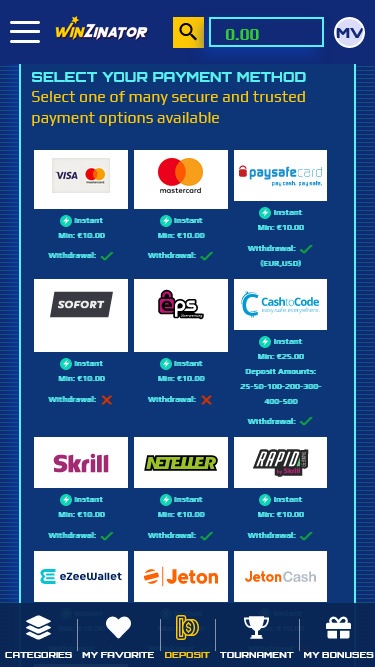 Варианты банковских операций в Winzinator Casino