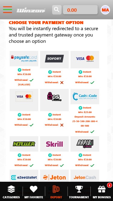 Что касается способов оплаты, Winzon Casino предлагает широкий выбор отличных вариантов. Игроки могут выбрать из популярных платежных систем, таких как Visa, MasterCard, Neteller и Skrill. Также есть возможность оплаты криптовалютами , поскольку этот способ оплаты уже довольно давно пользуется популярностью.