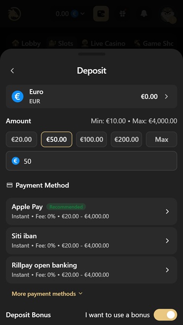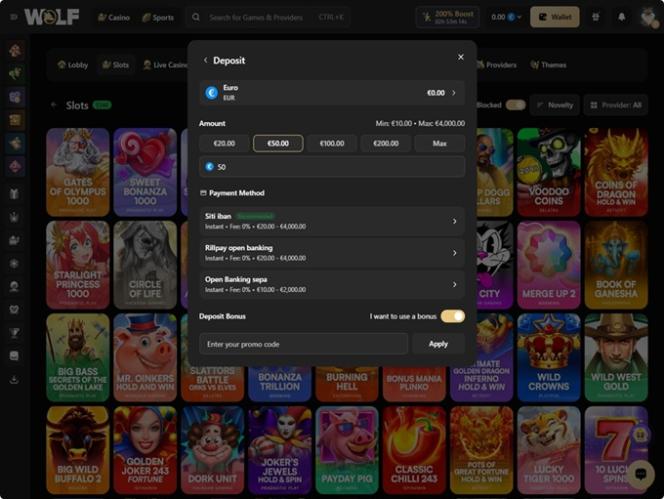 Что касается платежей, Wolf.io принимает множество банковских способов для пополнения и вывода средств, включая такие популярные, как Visa , Mastercard , банковский перевод, Skrill , Neteller, Apple Pay, Google Pay и SOFORT. Кроме того, пользователи могут управлять средствами в нескольких криптовалютах, включая Bitcoin , Bitcoin Cash , Cardano, Dogecoin, Ethereum , Litecoin , Solana, Tron , USD Coin , Tether и Ripple .