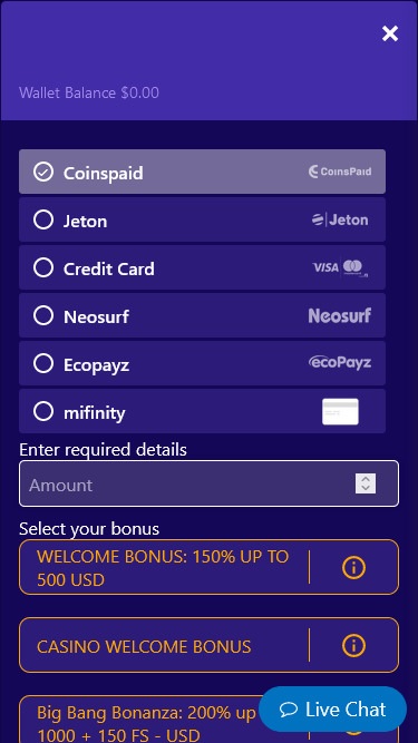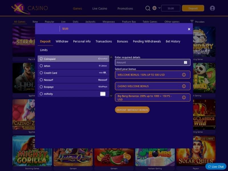 Что касается доступных игрокам способов оплаты, к сожалению, вы не сможете вносить или выводить средства в криптовалюте. К счастью, X1 Casino предлагает широкий выбор вариантов оплаты. Среди наиболее популярных — Visa, Neteller, ecoPayz, Flexepin, Paysafecard и Sofort. Также можно использовать Skrill .