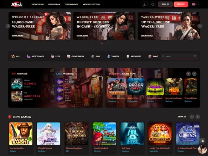 Если вы поклонник онлайн-казино в азиатском стиле, вам, несомненно, понравится проводить здесь время. Интерьер оформлен в художественном стиле, вдохновленном традиционной японской культурой, и прекрасно изображает все ее известные элементы, такие как смертоносные самураи и грозные члены якудзы.