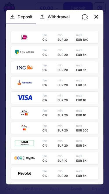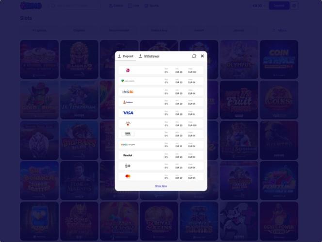 Игроки могут внести депозит в любое время онлайн, используя свою дебетовую или кредитную карту, электронный кошелек, банковский перевод или любой из доступных способов пополнения счета на странице «Пополнение».